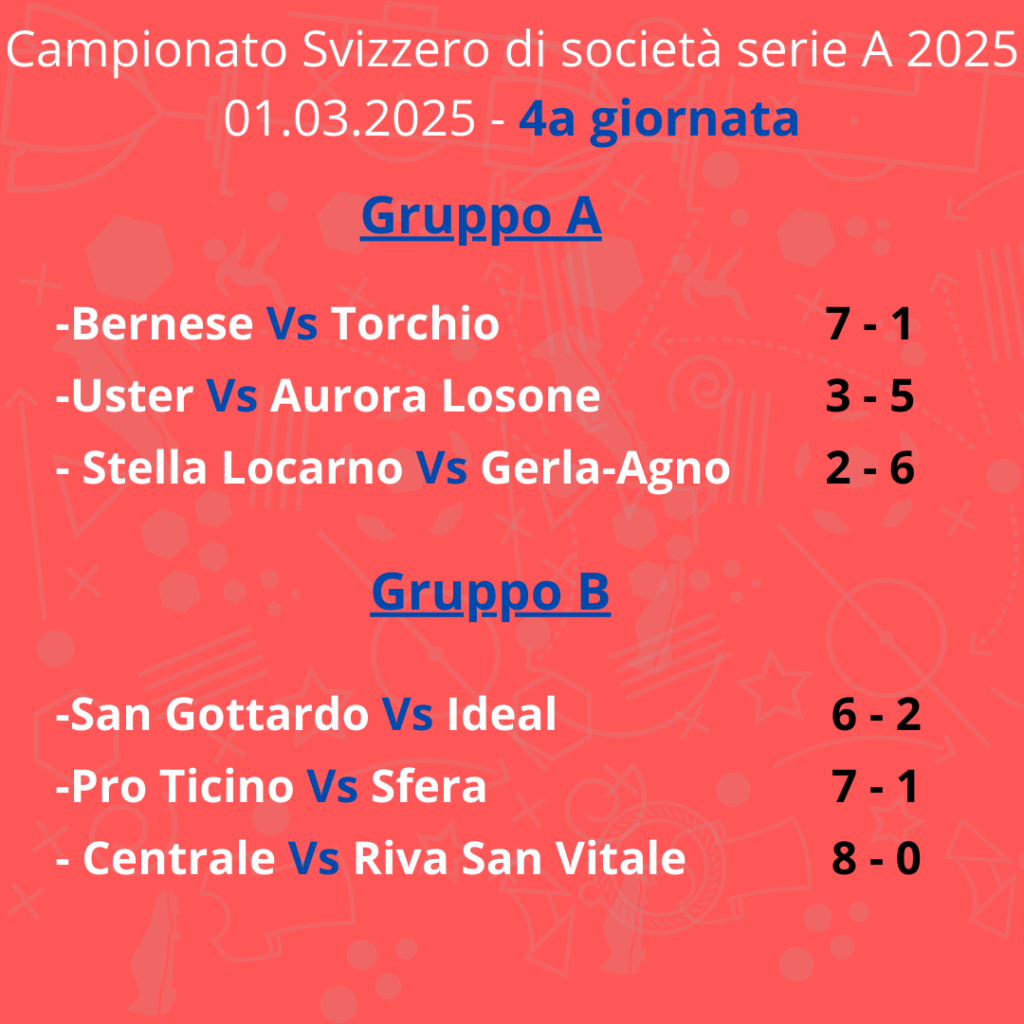 Si riscatta la Pro Ticino di Zurigo dopo le due sconfitte nella giornata iniziale. Soffrono la Sfera e Riva San Vitale, entrambe sonoramente battute. Maluccio, anzi… malaccio, l’Ideal che è il Club detentore del titolo, ancora al palo.