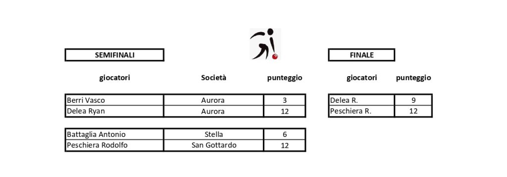 Come è capitato molto sovente in questi anni, ha vinto Rodolfo Peschiera. Il giocatore della San Gottardo, appena può, è presente in ogni dove del Ticino e della Svizzera. E lo fa per dare il meglio di sé stesso, tant’è che i suoi successi non si contano oramai più.Gli spettatori presenti la sera conclusiva hanno potuto godere uno spettacolo emozionante. A sfidare Peschiera si è presentato Ryan Delea, uno dei non pochi giovani rampanti dell’Aurora di Losone, che in semifinale aveva mandato ai box il compagno di Club Vasco Berri. Quando il chiassese sembrava avviato verso un successo troppo facile, sul parziale di 9 a 1, il locarnese ha beneficiato dell’uscita del pallino, per altro ben colpito, e ha dato il via a una rimonta inattesa che lo ha portato sul parziale di 9 a 11. Per finire, tuttavia, Peschiera ha trovato lo spunto per chiuderla e per suggellare l’ennesimo successo di questa per ora straordinaria stagione.Buon terzo anche Antonio Battaglia della Stella Locarno.