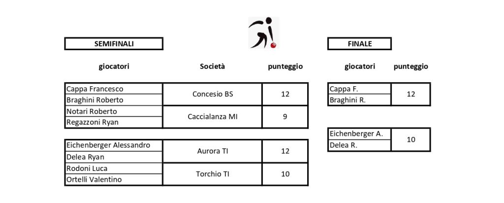 Le fasi finali, le semi e l’incontro decisivo, sono state molto equilibrate. Merito soprattutto dei giocatori ticinesi capaci di approdare fin lì. Luca Rodoni e Valentino Ortelli (Torchio), dopo aver eliminato Roberto Antonini e Fernando Paone (Arcos Brescia), una delle coppie più accredidate, sono stati supertati per 12 a 10 da Ryan Delea e Alessandro Eichenberger (Aurora Losone). Nell’altra semifinale i futuri vincitori hanno avuto la meglio sulla formazione italosvizzera della Caccialanza di Milano di Roberto Notari e Ryan Regazzoni (12 a 9).