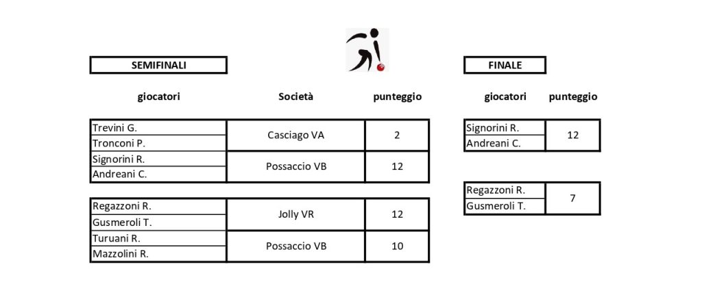 Le due coppie sono approdato all’atto finale dopo aver battuto per 12 a 2 Giorgio Trevini e Pietro Tronconi della Casciago (VA) e l’eccellente Roberto Turuani con il bravissimo giovane Roberto Mazzolini, anche loro della Possaccio, dopo una serrata sfida (12 a 10) con Regazzoni e Gusmeroli.
