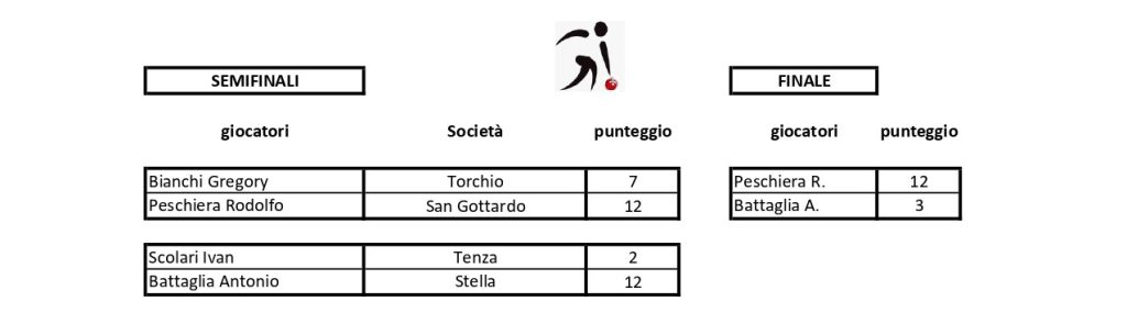 In finale Peschiera si è trovato Antonio Battaglia della Stella Locarno, colui che in coppia con Marcello De Micheli lo aveva eliminato pochi giorni prima nella semi della “Boccia d’oro” di Chiasso. Ma l’ottimo giocatore stellato si era speso nelle partite precedenti superando nettamente Vittorino Solcà (Riva San Vitale) per 12 a 1 e poi Ivan Scolari (Tenza) per 12 a 2. Nulla ha più potuto, 3 a 12, al cospetto del campione della San Gottardo.