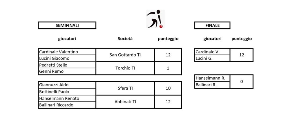 L’impresa è tutt’altro che scontata perché in quel settore si dilettano ancora giocatori dalla carriera rilevante. Il percorso dei due chiassesi ne è la conferma. Nei quarti Antonio Battaglia e Giuseppe Cinicola che illustrano da parte loro la Stella Locarno, in semifinale i due pilastri della Torchio Remo Genni e Stelio Pedretti e in finale gli abbinati Renato Hanselmann (Pregassona-Lugano) e Riccardo Ballinari (Centrale) che sull’onda del clamoroso successo al Campionato Svizzero “open” di un paio di settimane fa sembra intenzionato a offrire ancora prestazioni davvero interessanti.