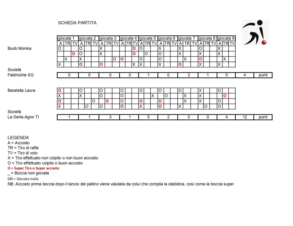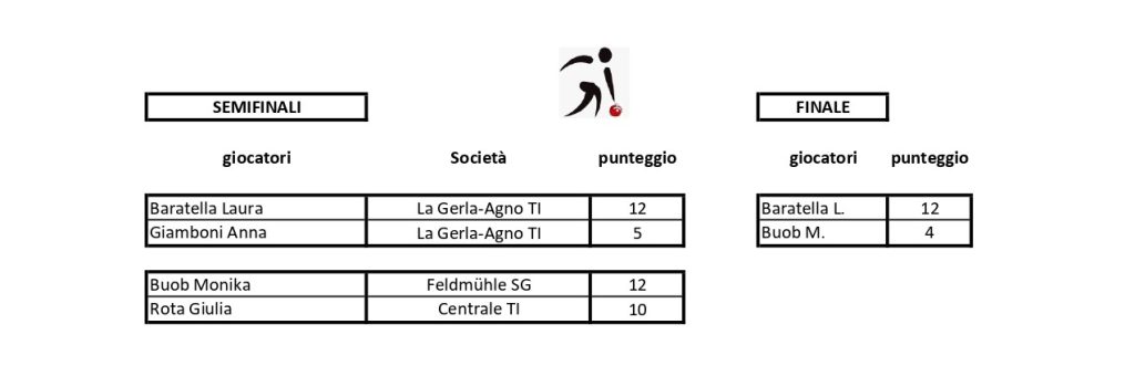 In apertura di torneo, Laura Baratella ha incontrato Giulia Rota (Centrale), 12 a 2. Poi Alice Bernaschina (Ideal), battuta per 12 a 6. In semifinale l’eterna rivale-compagna di coppia Anna Giamboni (Gerla-Agno): 12 a 5. L’ex-campionessa svizzera Monika Buob (Feldmühle) ha racimolato 4 punti.