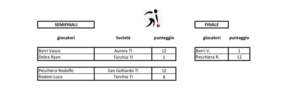 Rodolfo Peschiera ha piegato prima Alessandro Eichenberger (Aurora) e poi Ryan Delea (Torchio) con un doppio 12 a 3. In semifinale Luca Rodoni (Torchio) con il punteggio di 12 a 8. Vasco Berri (Aurora), per finire, ha rimediato un solo punticino. Le schede e le percentuali che pubblichiamo a lato dicono più delle parole.
