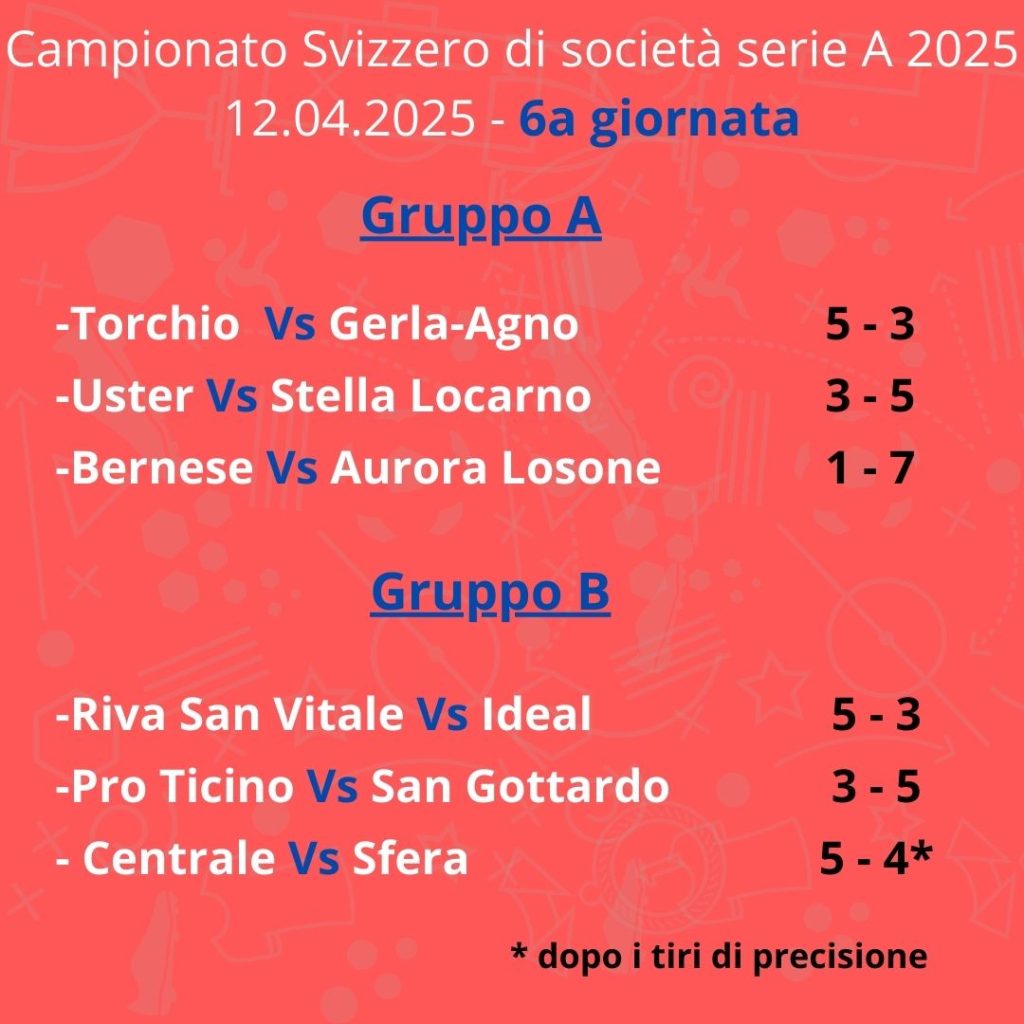 La Stella Locarno è comunque tallonata da vicino dalla Torchio e dall’Aurora, anche loro vincitori a spese della Gerla-Agno e della Bernese. Quando mancano quattro turni alla fine delle fasi preliminari sembra di poter affermare che i primi tre Club si sono garantiti i playoff. Il quarto posto è una questione tra la Gerla-Agno che dovrà vedersela con i mai paghi amici della capitale. Uster sembra invece condannato agli insidiosi playout.