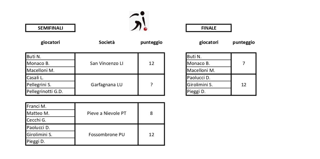 18.10.2025 21°Memorial Carlo PellegriniGara nazionale a terna A B C D a estinzioneSoc. Bocc. Pieve a Nievole, Pieve a Nievole PTI finalistiI vincitori Girolimini S., Paolucci Davide e Pieggi D.