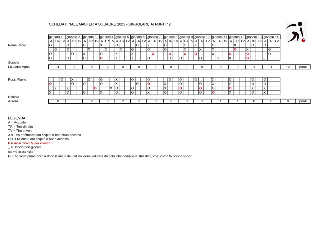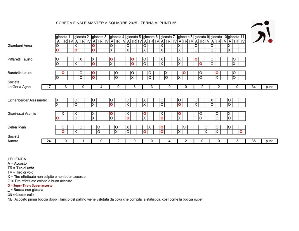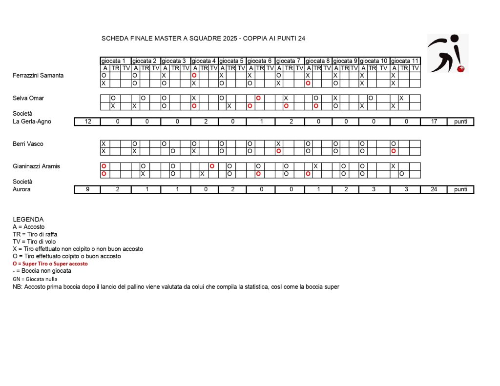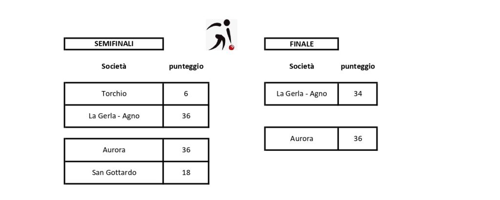 Hanno vinto i giovani rampanti dell’Aurora di Losone: Aramis Gianinazzi, Alessandro Eichenberger, Vasco Berri e Ryan Delea. Con loro i più esperti Flavio Rossi e Luca Lorenzetti. La prestazione migliore l’hanno profusa nella semifinale contro la San Gottardo. A Rodolfo Peschiera l’Aurora ha opposto Flavio Rossi che ha comunque rimediato un sufficiente 12 a 6. In seguito la coppia e la terna dei chiassesi hanno fornito prestazioni non certo all’altezza delle loro riconosciute capacità. L’Aurora si è imposta, per finire, con un inatteso 36 a 18.