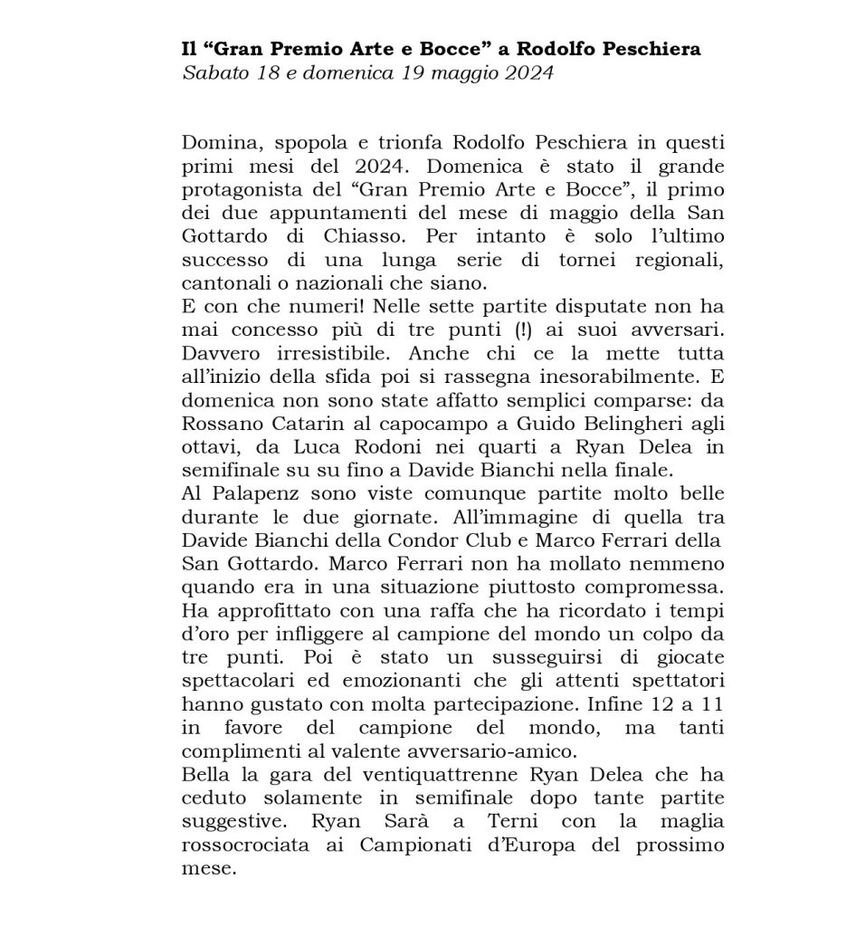 19.05.2024 GP Arte e Bocce, Gara nazionale individuale ad intreccio FSBSB San Gottardo, Chiasso I Finalisti: Bianchi D., Peschiera R., Delea R., Ferrari M. Il vincitore: Peschiera R.