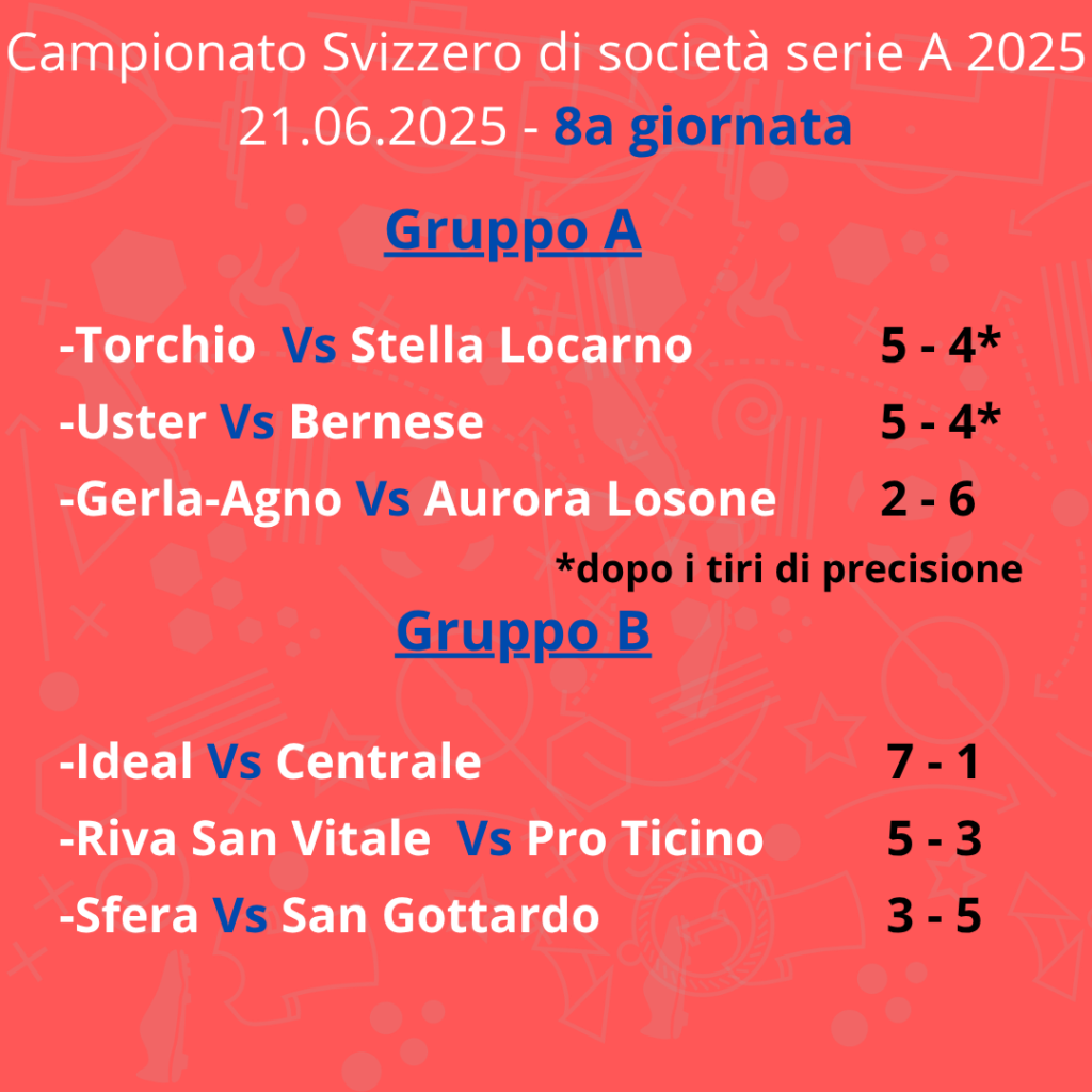 Molto più serrata la lotta nel gruppo A. Il big match di giornata tra la Torchio e la Stella Locarno si è risolto in favore dei biaschesi solamente dopo i tiri di precisione. Così come ai tiri di precisione si è risolta in favore del BC Uster la sfida d’oltre Gottardo con il BC Bernese. Gli zurighesi, già destinati ai playout, cancellano lo zero nella classifica. Il punto conseguito dai bernesi permette loro di staccare la Gerla-Agno, battuta nettamente dall’Aurora di Losone che ha così raggiunto la Torchio in testa alla classifica.