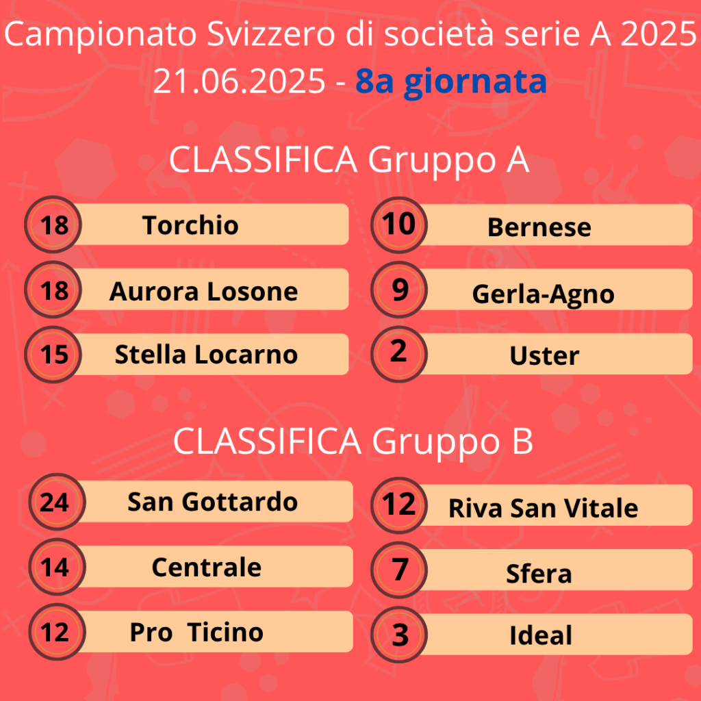 Sabato scorso il Club di Chiasso è andato a vincere per 5 a 3 contro la Sfera sulle corsie del Centro nazionale sport bocce di Lugano. Ancora una volta la San Gottardo ha schierato alcuni suoi giovanissimi giocatori della scuola bocce. Per loro si tratta di esperienze fondamentali in piena crescita sportiva. Nel medesimo gruppo registriamo il primo successo, giunto solamente all’ottavo turno, dell’Ideal contro la Centrale di Novazzano. Ma più della vittoria stupisce il risultato: 7 a 1! I ragazzi del “Coach” Doriano Ferrari hanno concesso un solo set in una delle due coppie. Mancano ancora due turni, ma sulla scia di questa vittoria il Club di Coldrerio si può preparare con molto ottimismo per i playout che è già sicuro di dover disputare. La Centrale, dal canto suo, mantiene il secondo posto del girone grazie al successo che Riva San Vitale ha ottenuto contro l’insidiosa Pro Ticino di Zurigo. Sono davvero felici i ragazzi di Edo Vassalli che sventano con moltissime probabilità la denegata ipotesi di dover lottare per mantenere il posto nella serie A. Anzi, Riva San Vitale potrà addirittura dire la sua anche nei prossimi playoff.