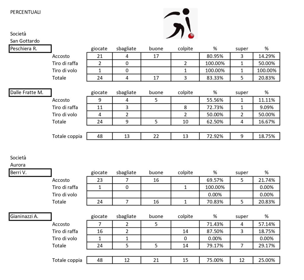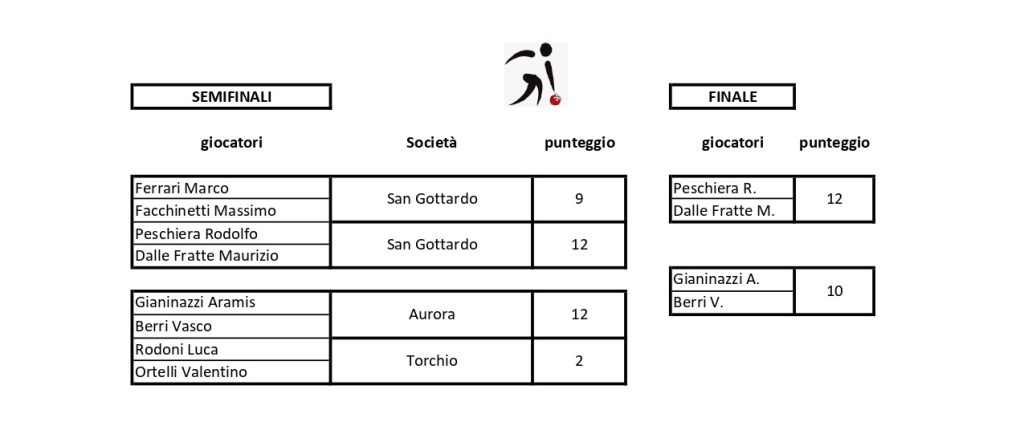 Nelle semifinali della gara dell’Ideal, svoltesi alla Cercera, si sono presentate altre due formazioni di grosso calibro. Luca Rodoni e Valentino Ortelli (Torchio) sono stati battuti nettamente da Gianinazzi e Berri; Marco Ferrari e Massimo Facchinetti si sono piegati solamente per 12 a 9 al cospetto dei due compagni di squadra.