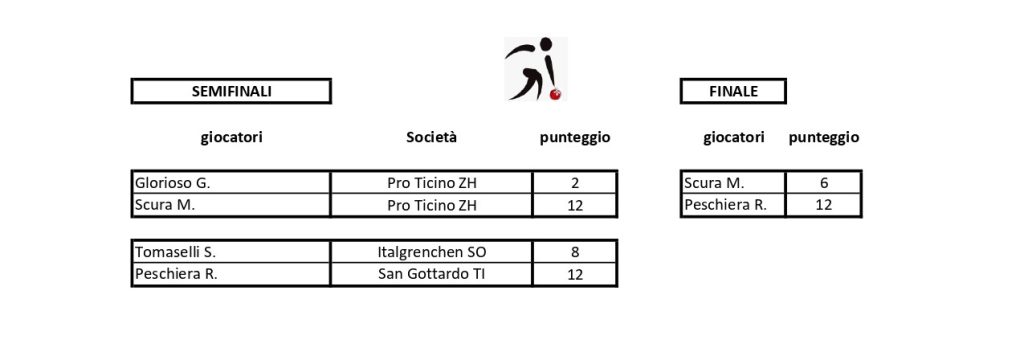 In finale, sull’altro lato del tabellone ufficiale è comparso il nome di Mario Scura, che strada facendo ha addomesticato gli avversari di ogni categoria. Eccellente il suo torneo, anche se al cospetto del campione chiassese nulla ha più potuto: 12 a 6 il risultato finale. L’altro semifinalista è stato il quindicenne Giulio Glorioso anch’egli della Pro Ticino di Zurigo. Il giovane ha già un curriculum di grande riguardo. Ricordiamo che, oltre a essere il detentore del titolo nazionale della sua categoria, nel 2023 (!) ha vinto il Campionato Svizzero a terne e che, una quindicina di giorni fa, a Lugano, è stato uno dei primattori della Federazione di Zurigo nella conquista della Coppa Svizzera. Da più parti Giulio Glorioso, nato e cresciuto da noi, è atteso a un cambio di cittadinanza che gli permetterebbe di essere tra la rosa dei nazionali svizzeri.