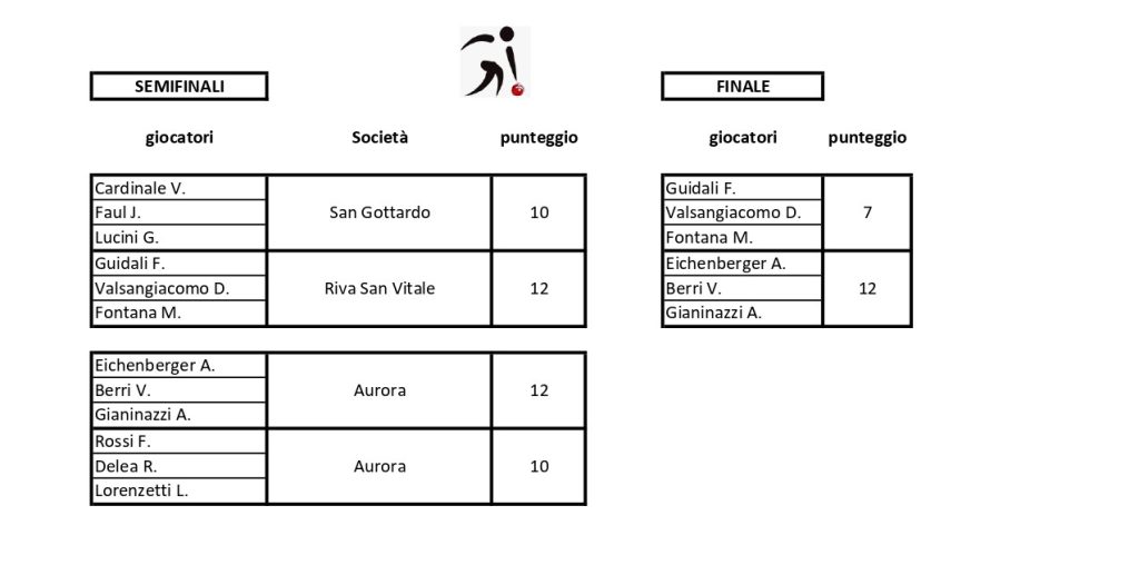 In semifinale la terna di Riva San Vitale ha regolato sul filo di lana, 12 a 10, quella della San Gottardo di Valentino Cardinale, Jacopo Faul e Giacomo Lucini. I quali non hanno approfittato di un paio di opportunità per accedere alla finale. Ottimo in ogni modo il loro torneo.