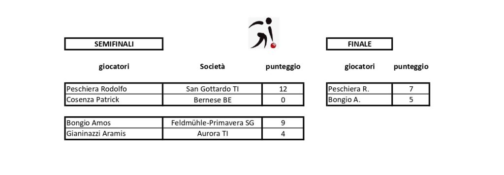 Ha domato qualsiasi avversario dall’alto della sua superiorità. Solamente in finale, il coriaceo e ottimo Amos Bongio (Feldmühle-Primavera), che in semifinale aveva eliminato Aramis Gianinazzi (Aurora Losone), lo ha impegnato fino allo spirare delle otto giocate: 5 pari dopo le prime sei, 6 a 5 dopo la settima e 10 a 5 al termine poiché Bongio, verosimilmente rassegnato dopo il primo errore, ha sbagliato gli altri tre tiri su un bellissimo punto dell’avversario. Nell’altra semifinale il giocatore della San Gottardo ha eliminato Patrik Cosenza, uno dei beneficiari della Wild Card, del Boccia Club Bernese.