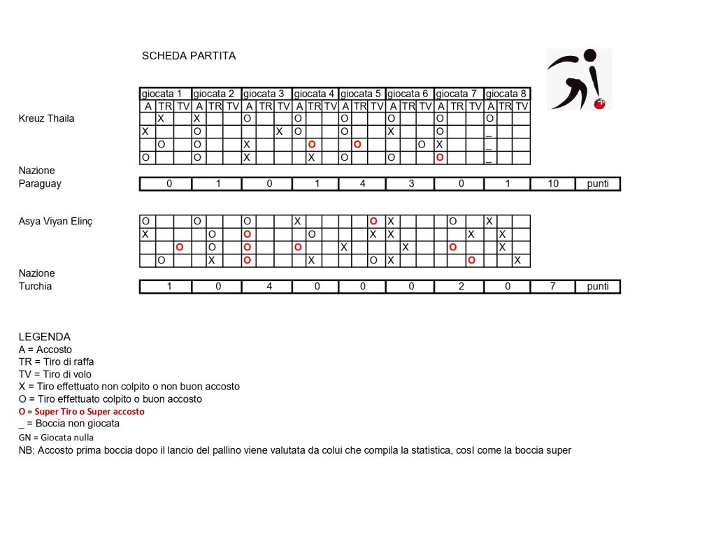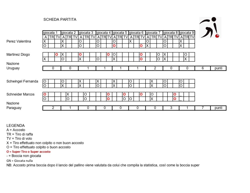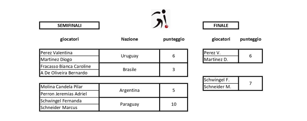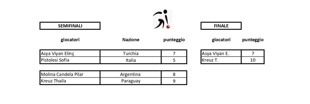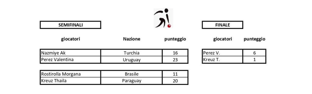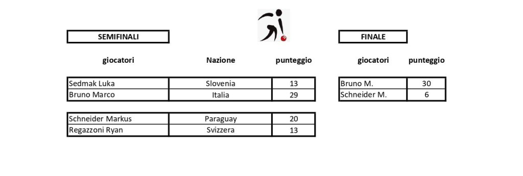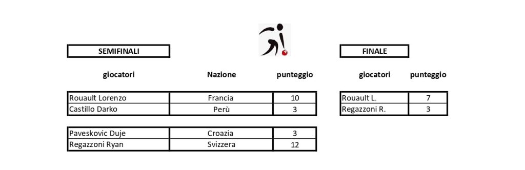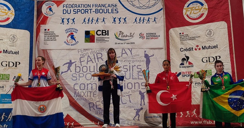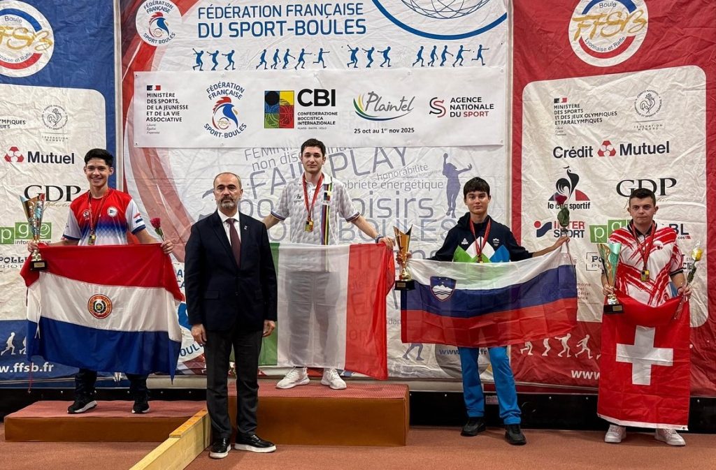 28.10-01.11.2025 Campionato del mondo di bocce juniorsCBI – Plaintel (Francia)Singolo femminileIl podioLe finalisteLa vincitrice Kreuz T. (Paraguay)Singolo maschileIl podioI finalistiIl vincitore Rouault L. (Francia)Coppia mistaIl podioI finalistiTiro di precisione femminileIl podioLe finalisteLa vincitrice Perez V. (Uruguay)Tiro di precisione maschileIl podioIl vincitore Bruno M. (Italia)